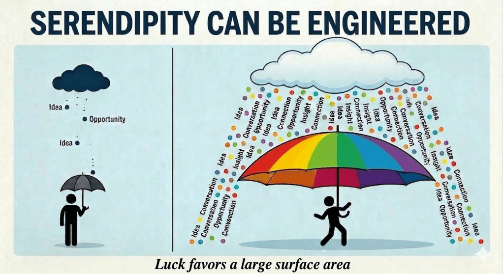 I’ve come to believe that this is one of the most limiting ideas we carry around. Serendipity isn’t something that happens to you. It is something you make room for. And the size of that room is almost entirely within your control.